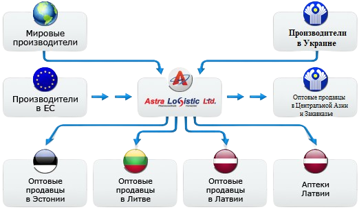 «Astra Logistic Ltd.» является провайдером фармлогистических услуг для третьих лиц (3PL) – производителей фармацевтической продукции, средств личной гигиены и пищевых добавок, находящихся как на территории стран ЕС, так и за её пределами (США, СНГ, Индия, Китай и др.) и специализирующихся на поставке данной продукции конечным потребителям в странах Балтии и республиках Центральной Азии иЗакавказья. |