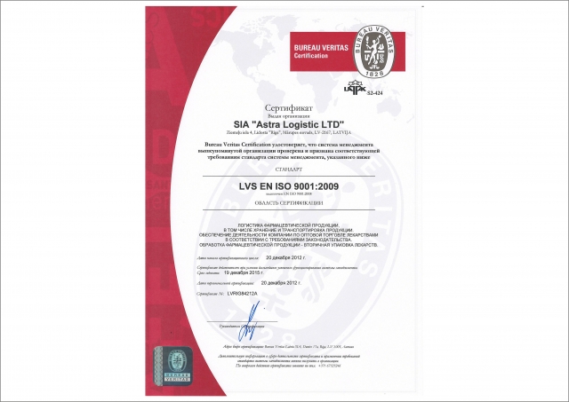 28 января 2016 г. компания Bureau Veritas провела аудит компании «Astra Logistic Ltd.» по новому стандарту 2015, согласно которому в Латвии на данный момент аудитированы только лишь 3 компании. Было получено положительное заключение аудиторов о соответствии всех процессов на предприятии вышеуказанному стандарту.